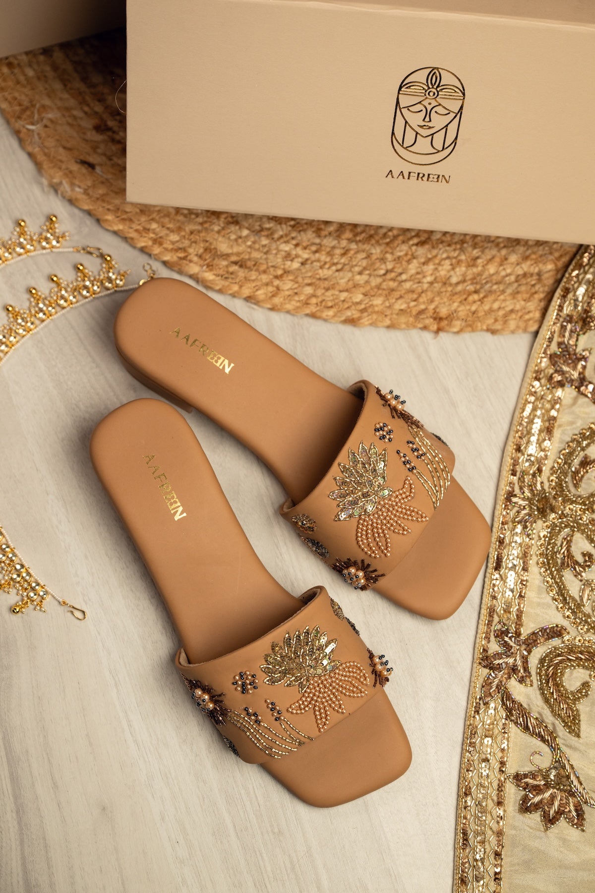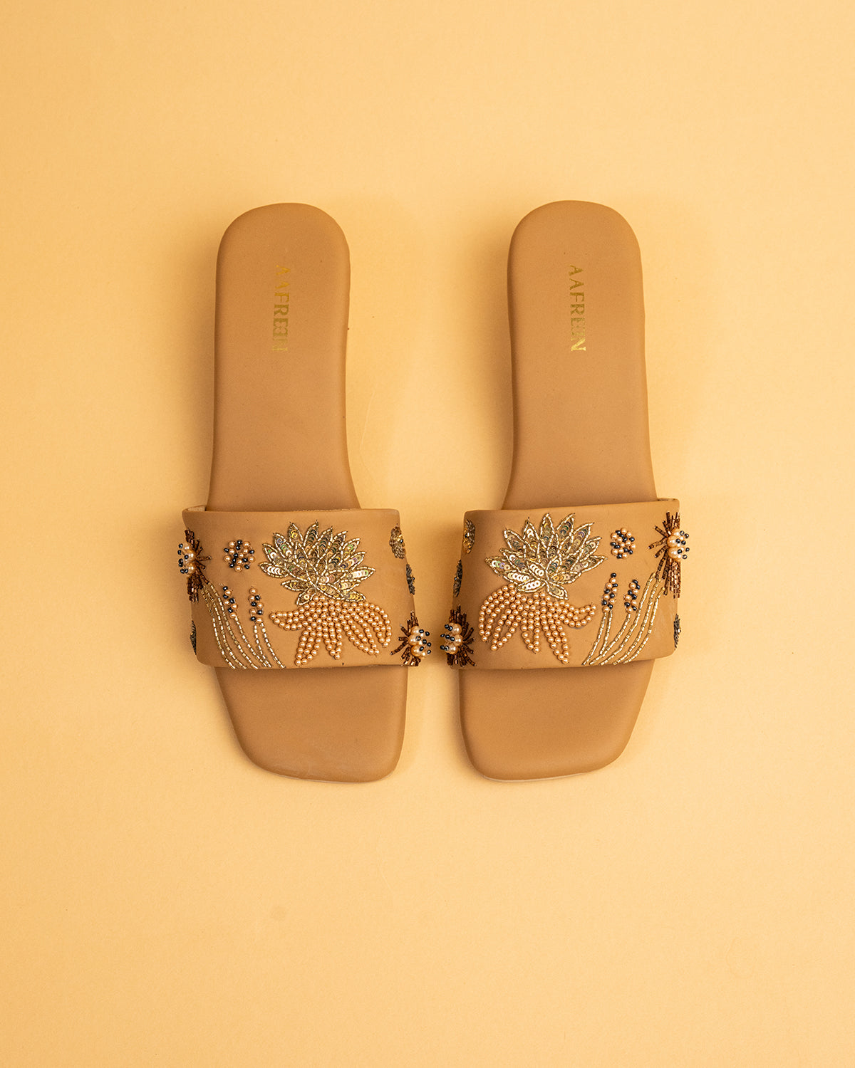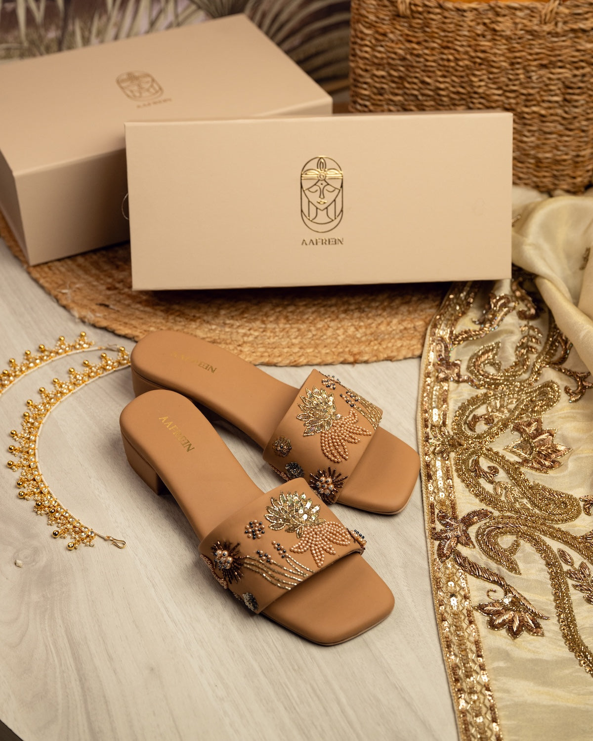 A timeless tan slip-on, elevated with hand-embroidered gold and silver floral motifs. Designed for versatile styling, it effortlessly complements festive ensembles and everyday elegance. With its cushioned comfort and intricate detailing, Amelia lets you shine with every step