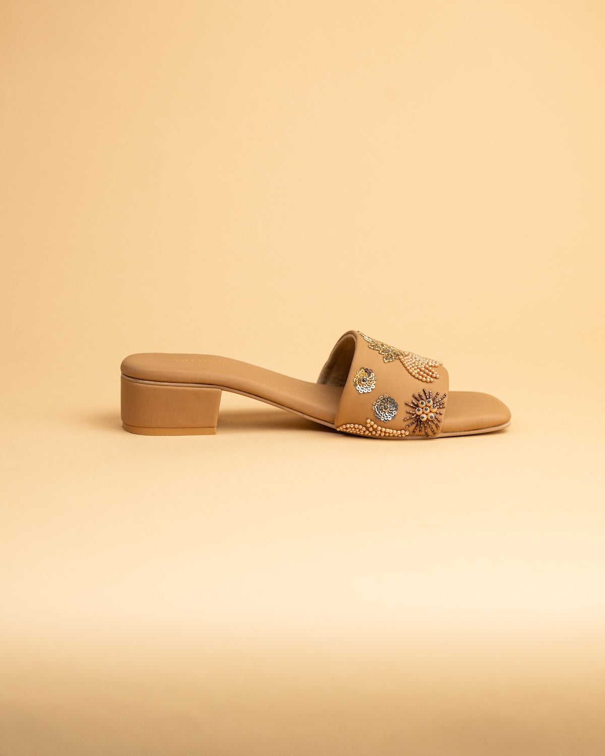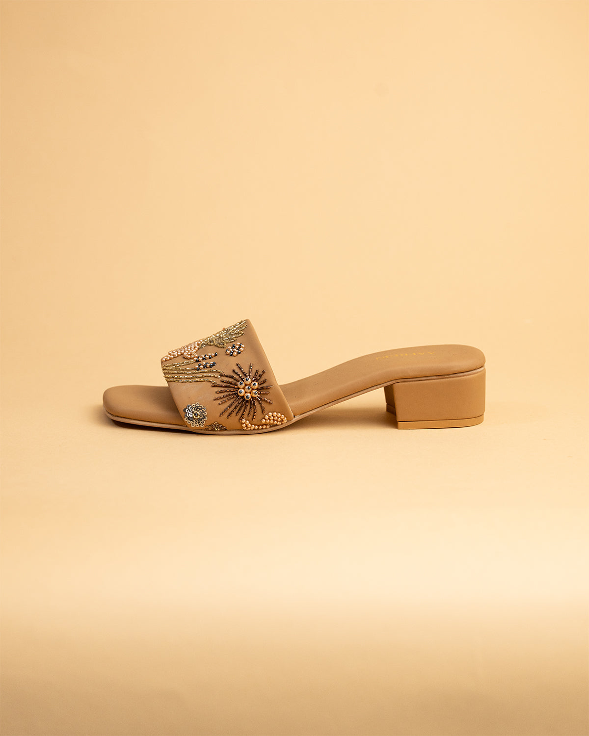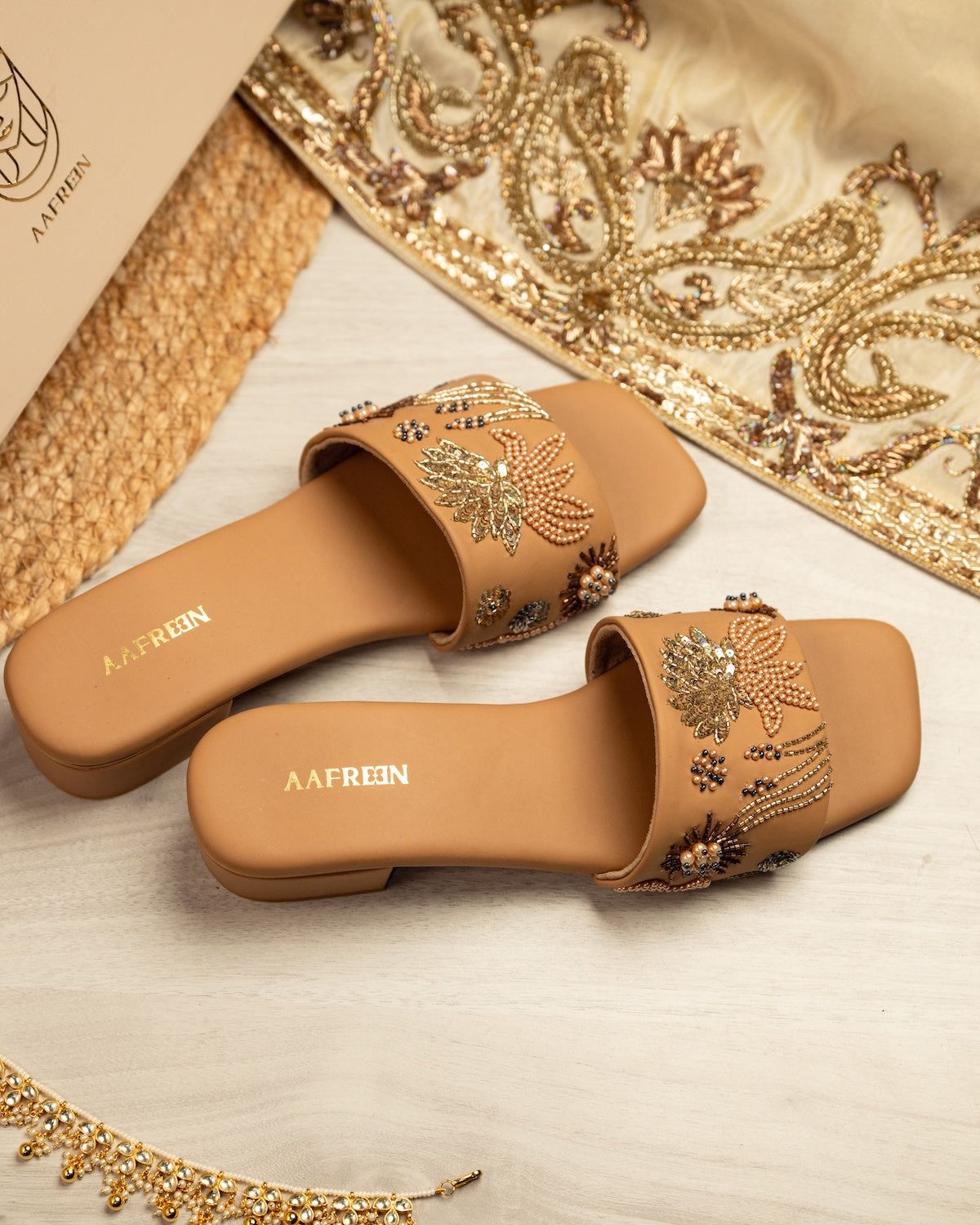 A timeless tan slip-on, elevated with hand-embroidered gold and silver floral motifs. Designed for versatile styling, it effortlessly complements festive ensembles and everyday elegance. With its cushioned comfort and intricate detailing, Amelia lets you shine with every step