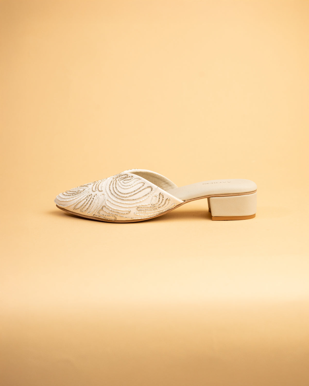 Arial blends strength and elegance in a refined ivory silhouette. The wide strap is adorned with intricate swirl-pattern embroidery in delicate beads and sequins, adding subtle sparkle to its minimalist design. Comfortable yet striking, Arial is the perfect choice for effortlessly elevating both festive and contemporary looks.