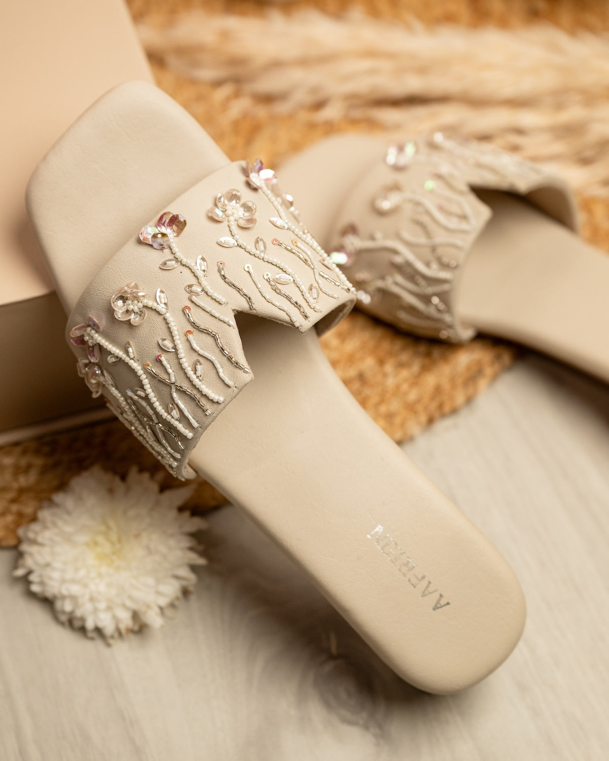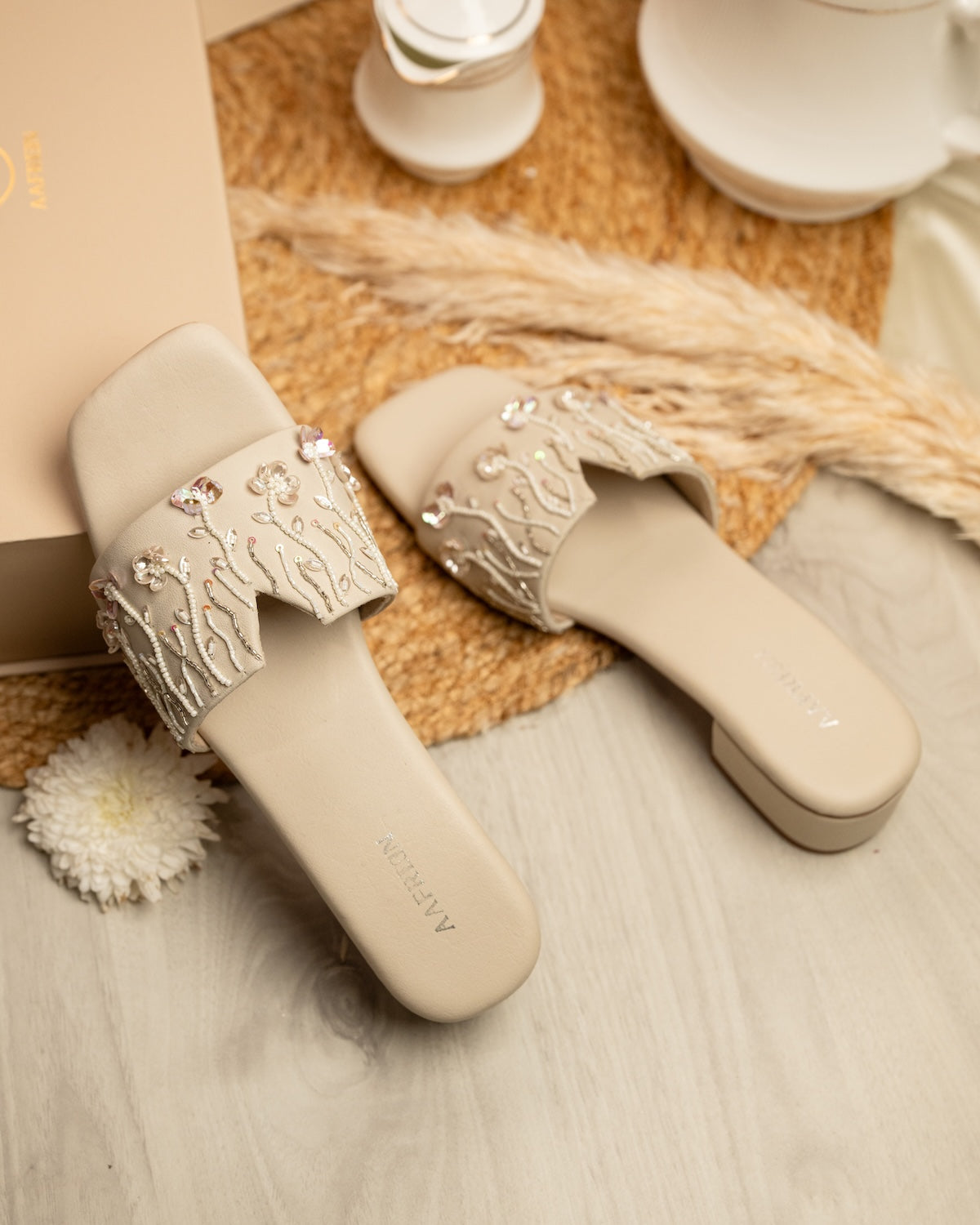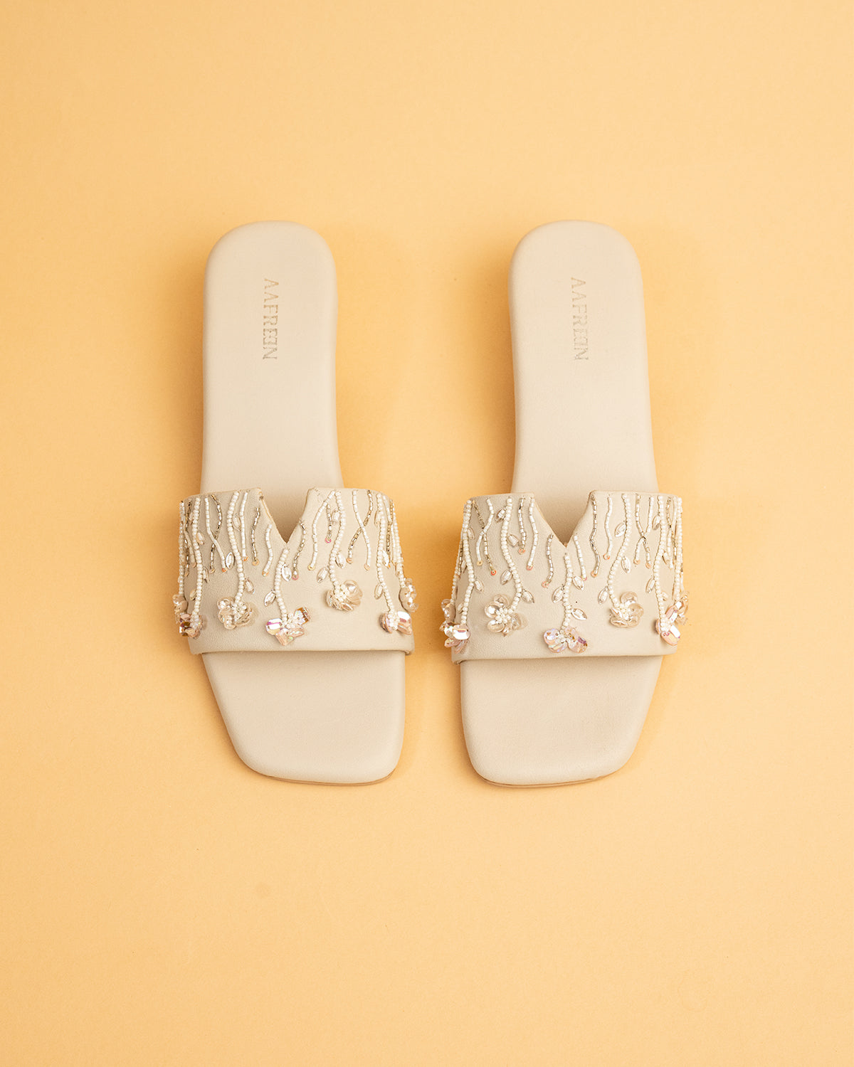 Elena is a vision of soft elegance. The nude base is delicately adorned with pearl beadwork and pastel pink crystal accents, forming graceful floral vines that shimmer with every step. Lightweight and timeless, Elena is the perfect choice for adding a romantic glow to both festive and casual ensembles.