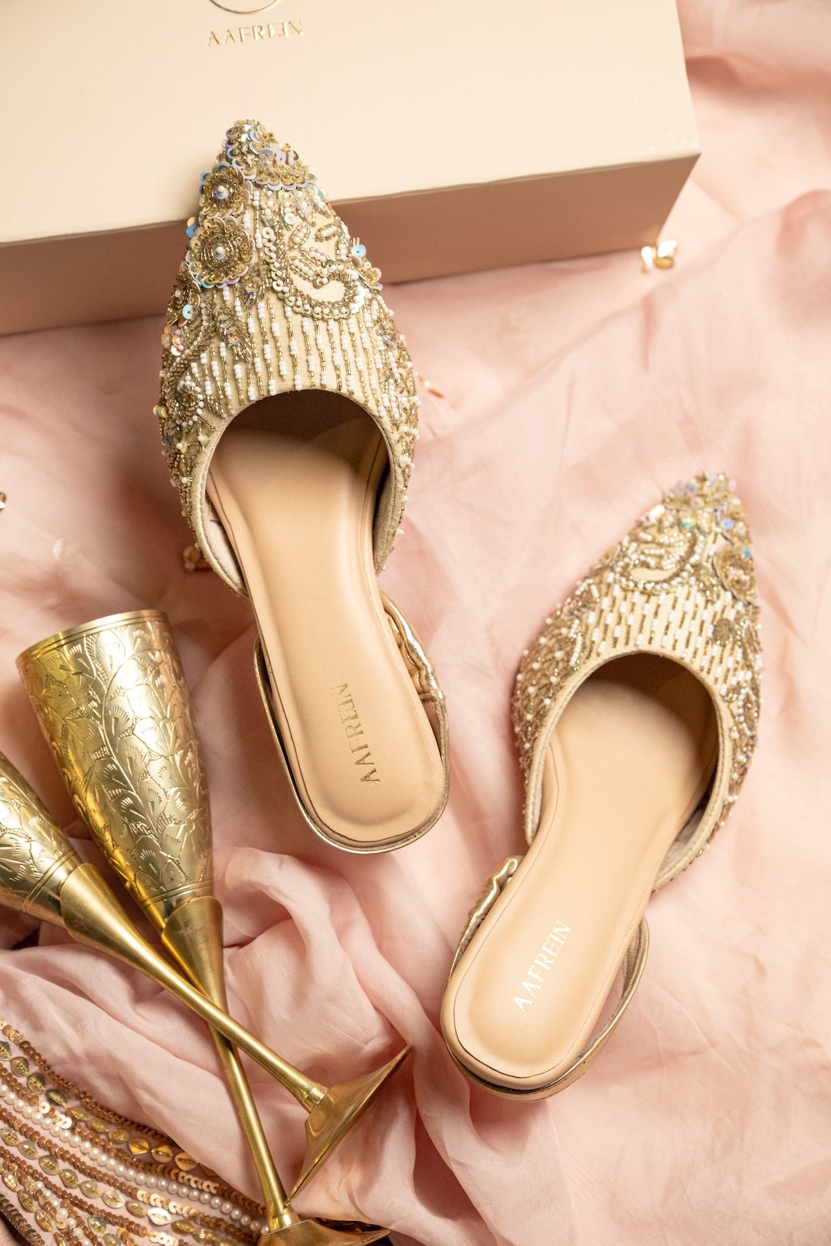 Jiya is a masterpiece of intricate craftsmanship and timeless grace. This ivory-toned pair is adorned with delicate pearl beading, shimmering sequins, and hand-embroidered floral accents that catch the light from every angle. Elegant yet opulent, Jiya is designed to add a soulful sparkle to your most cherished celebrations.
