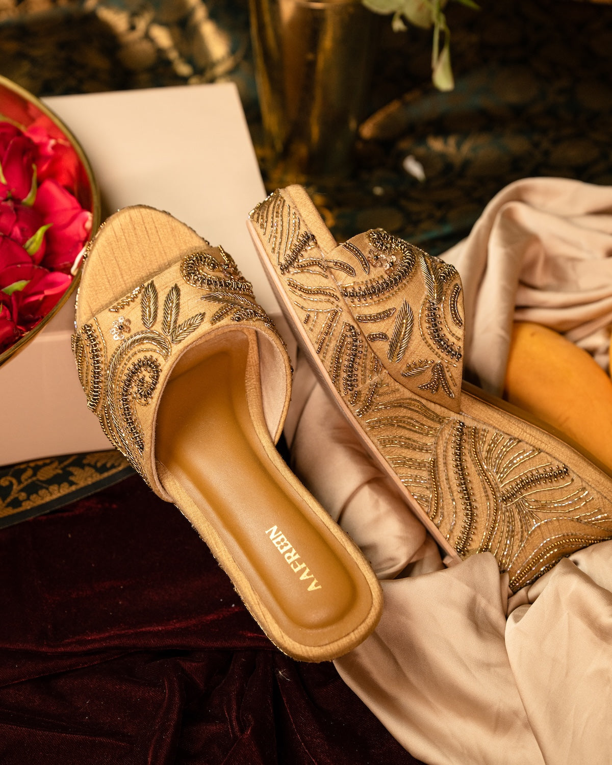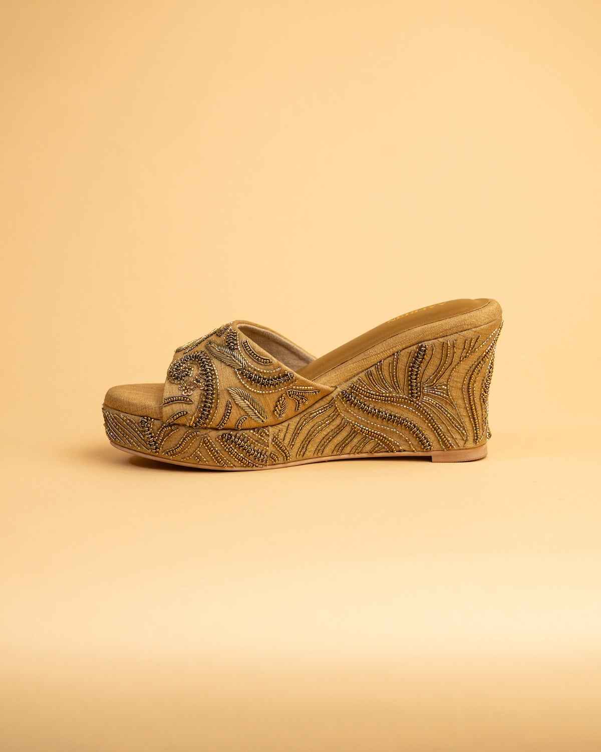 Miraki is a golden wedge that embodies craftsmanship at its finest. Adorned with intricate leaf and swirl embroidery, accented by shimmering sequins and beads, its design flows seamlessly from strap to sole. With a cushioned platform for lasting comfort, Miraki is where tradition meets elevated glamour, crafted straight from the heart.