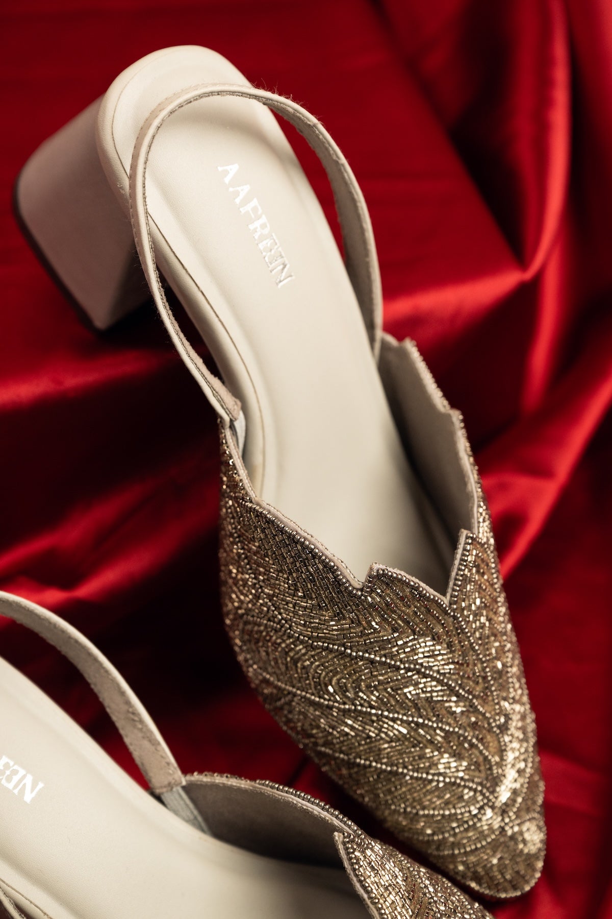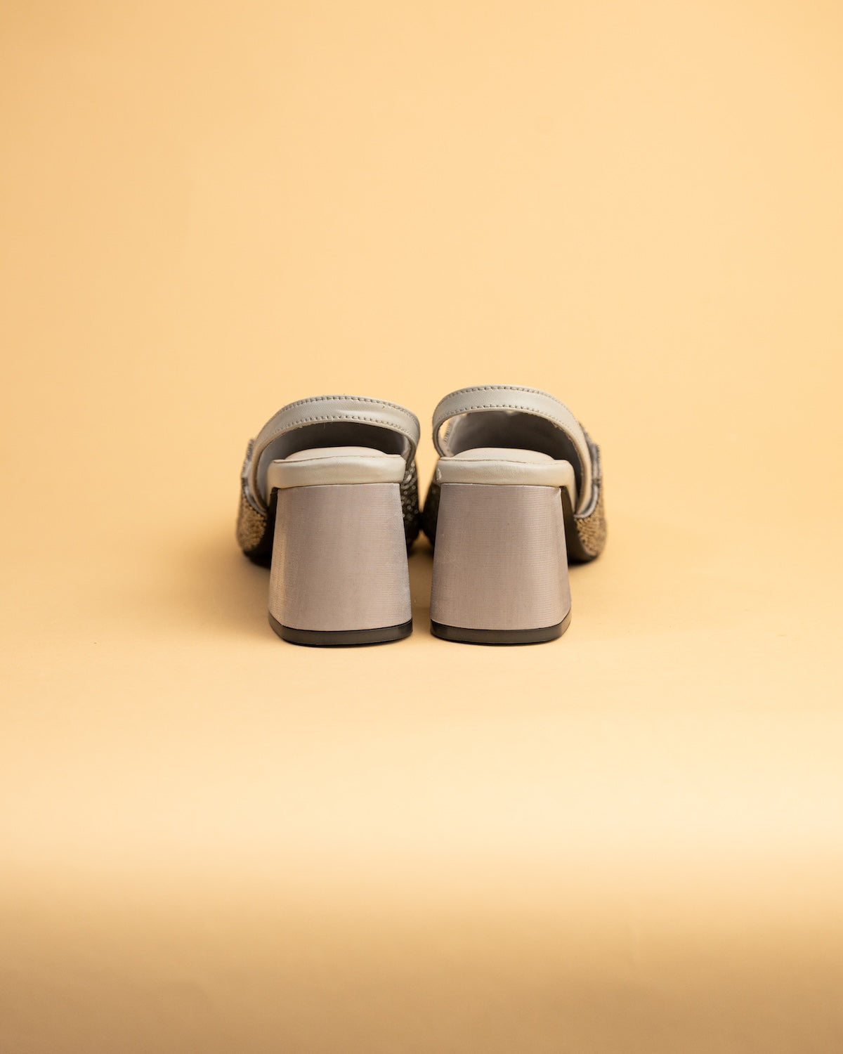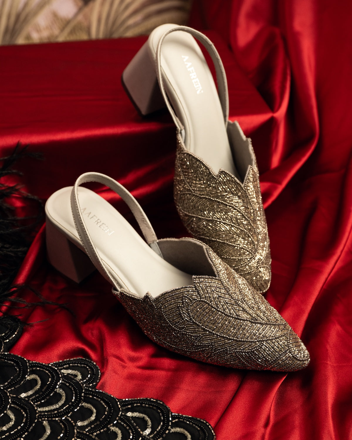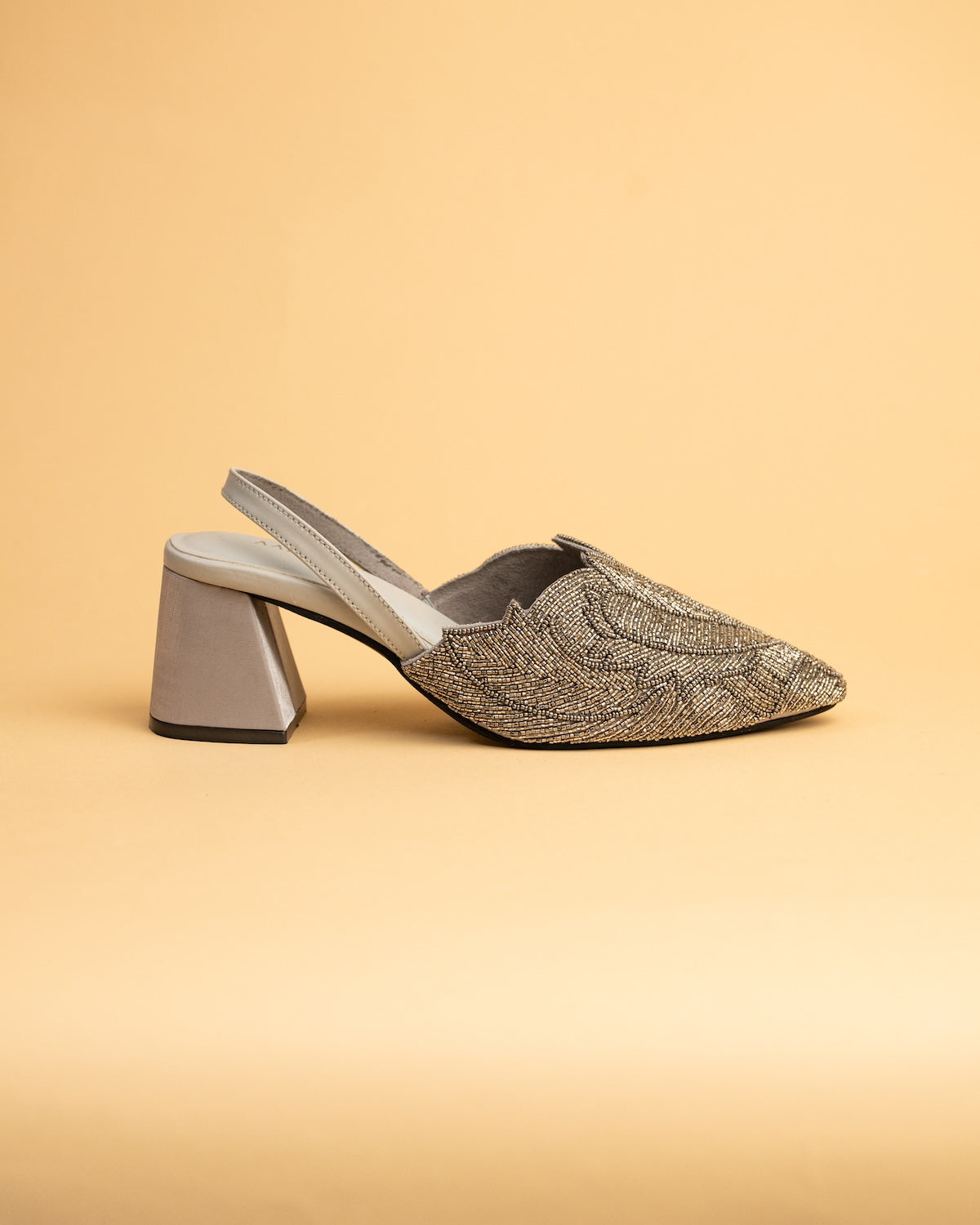 Zyra in silver is a vision of luminous elegance. Set on comfortable block heels, its shimmering hue adds a touch of glamour to every step, making it perfect for weddings, festive nights, and celebrations where you want to shine effortlessly.